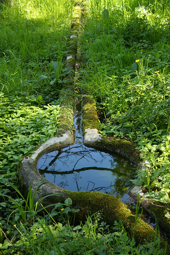 En bas de la parcelle, une source est récupérée dans une citerne voûtée sous un bel arc de décharge. Sur le flanc opposé du vallon, au-dessous du hameau du village, des jardins étaient cultivés aux XIXe et XXe siècles : ils étaient alimentés en eau par des sources, captées dans des citernes voûtées d’où l’eau s’écoulait par des béalières (canalisations taillées dans le grès) pour emplir des gourgues (bassins ronds d’environ 80 cm de diamètre, évidés dans un gros bloc de grès).
